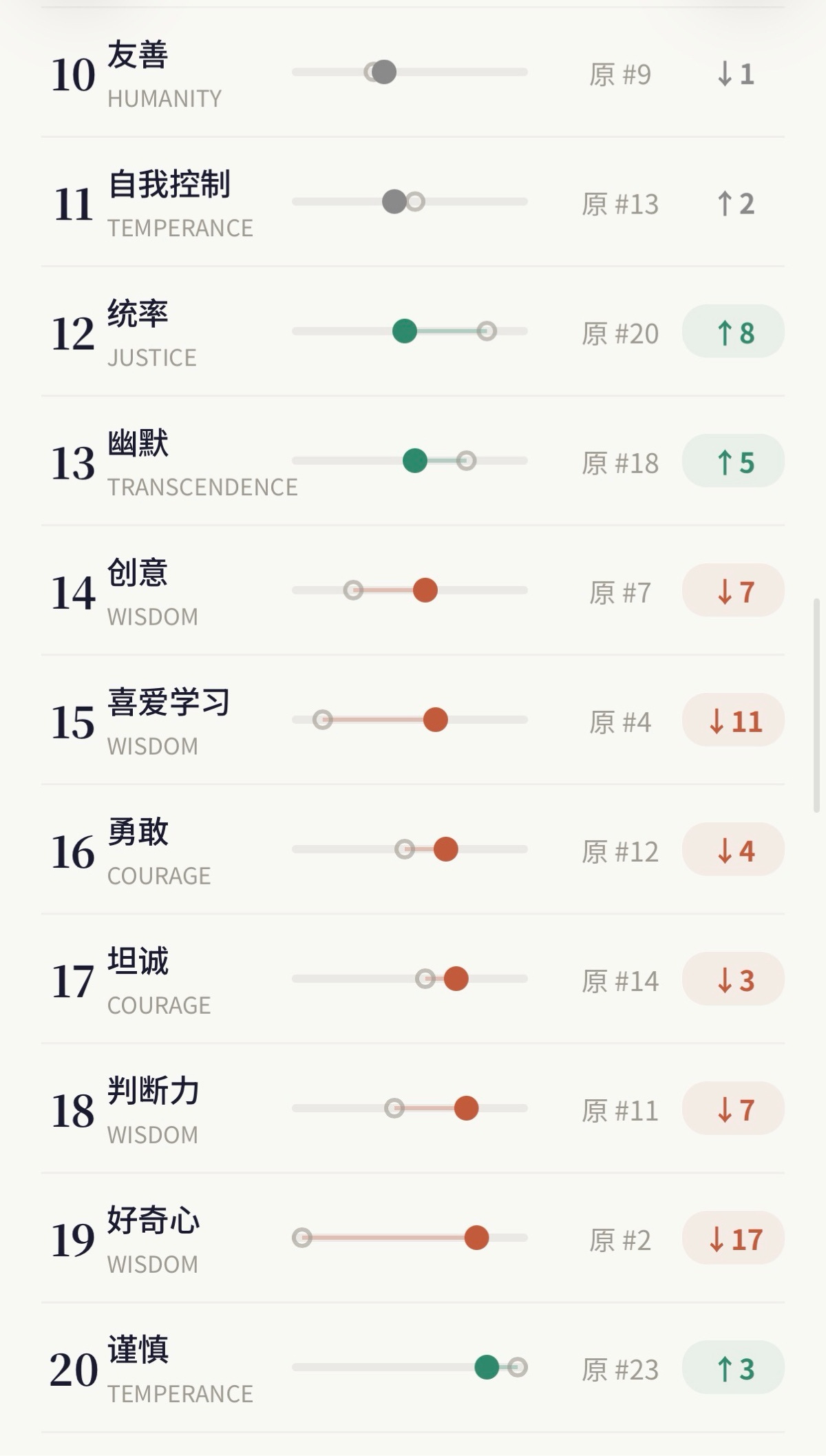 31-32岁的我看到的世界,跟29-30岁的时候已经不同了。而这些性格优势的排序,就像一面镜子,让你看到自己到底在往哪个方向长。