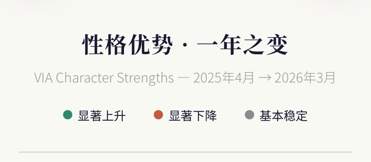 MBTI也好,九型人格也好,甚至星座,它们给你的感觉是”你就是这样的人”。但VIA不是。它告诉你的是”你现在是这样的”——这个”现在”会变。根据你的生活经历会变,根据你设置的目标会变,根据你的年龄和阅历也会变。