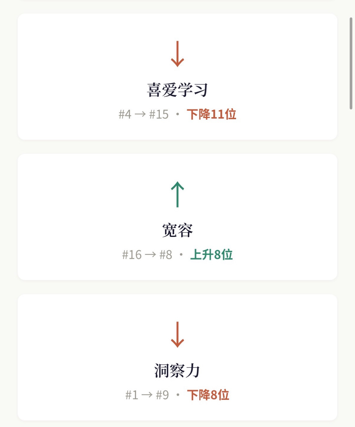 去年排第一的是”洞察力”,好奇心排第二,喜爱学习排第四——我那时候整个人就是处于一种”我什么都想了解、什么都想探索”的状态。