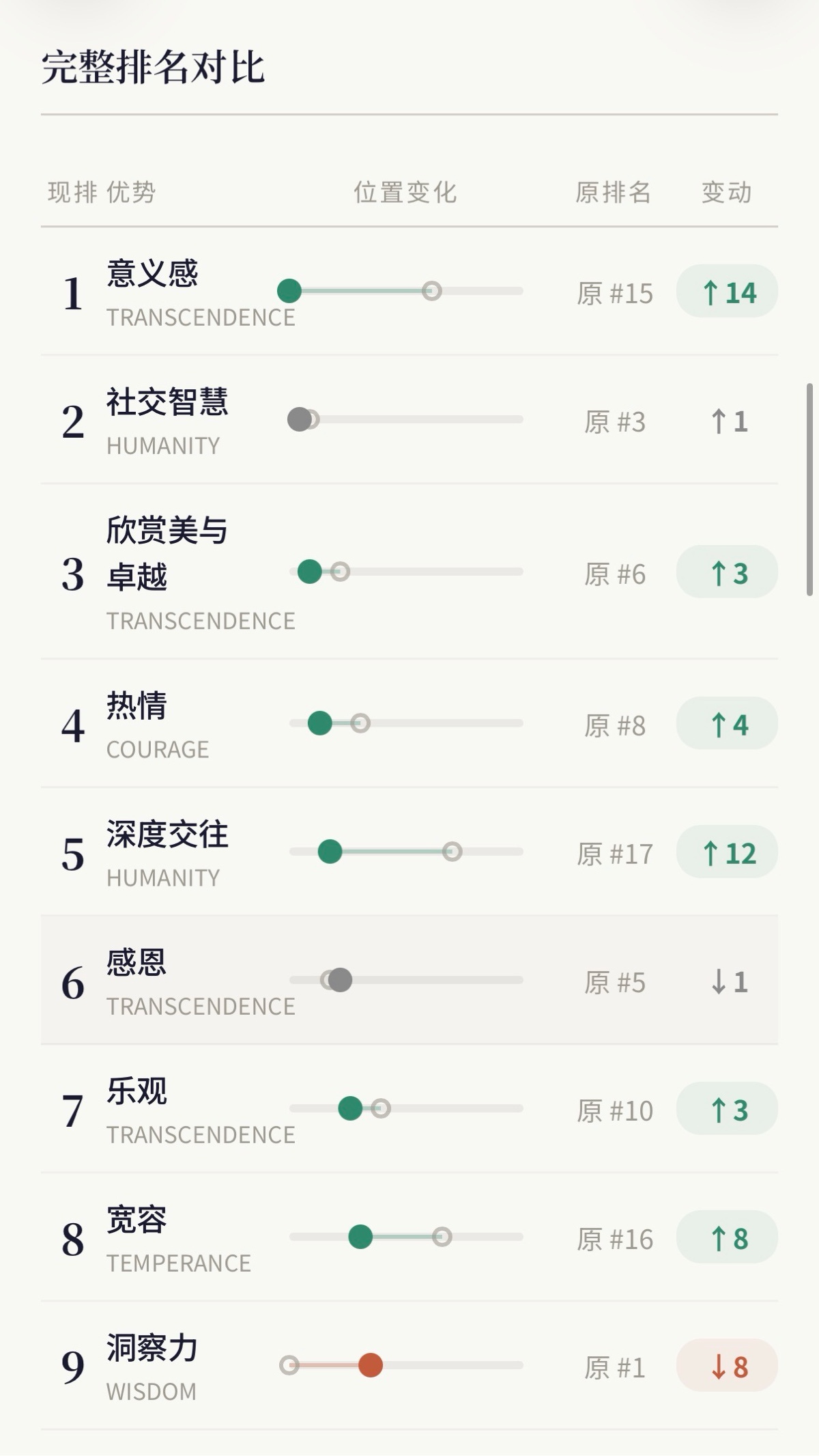 现在这三项分别跌到了第9、第19、第15。取而代之的是意义感、深度交往、欣赏美——全是关于”感受”和”连接”的优势。
