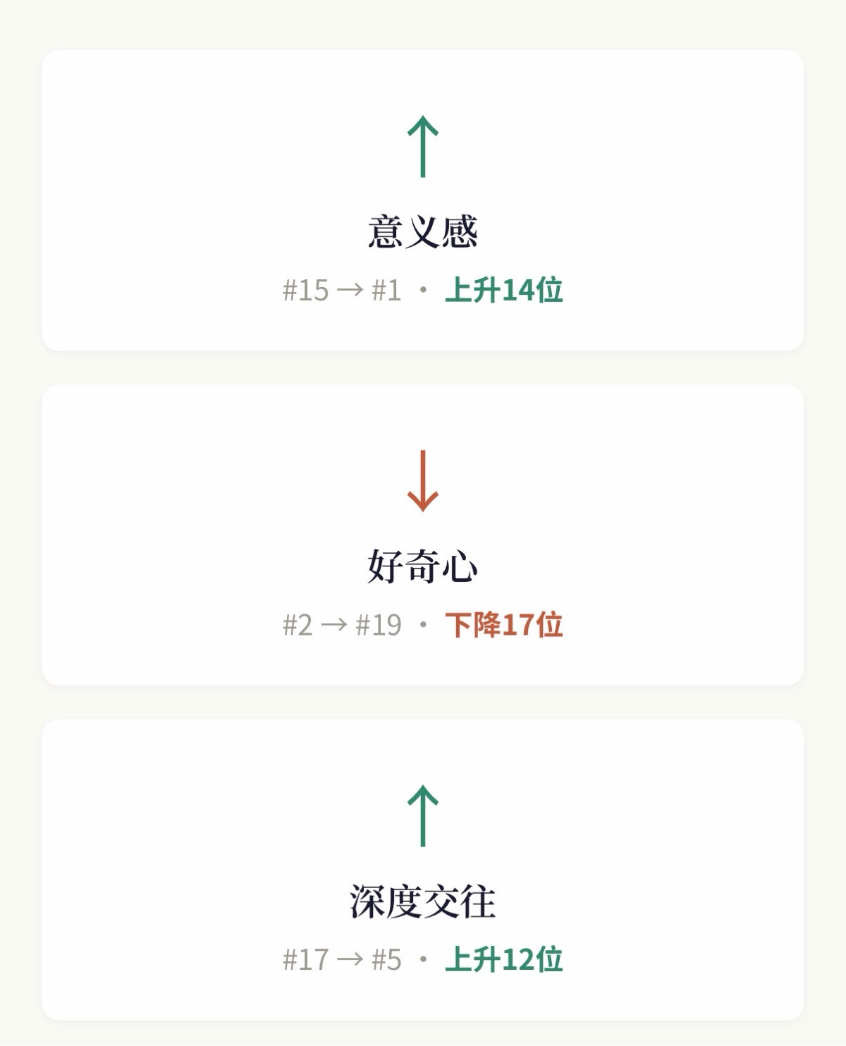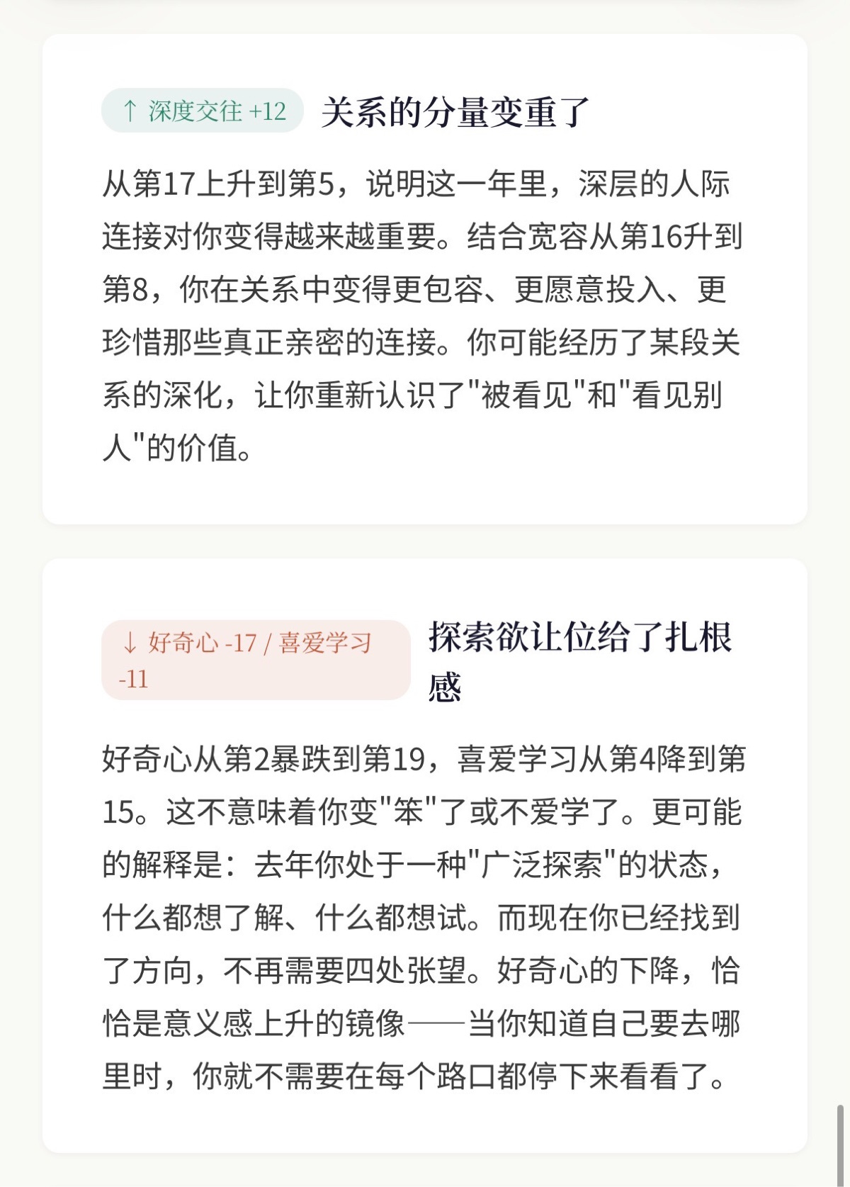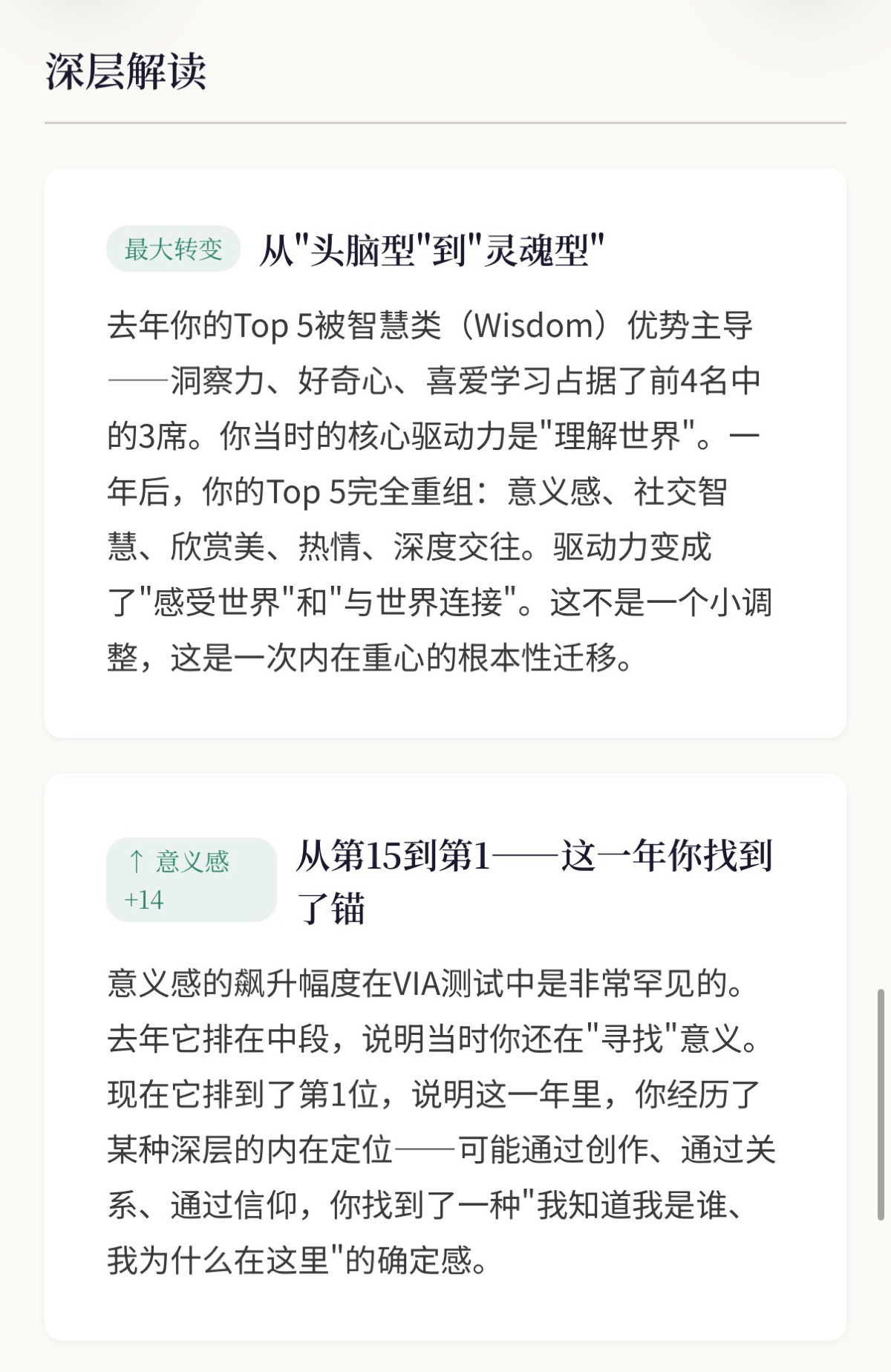 意义感:从第15飙升到第1,上升14位。 这是整份报告里最惊人的变化。去年意义感在你的中段,说明你当时还在寻找方向。
