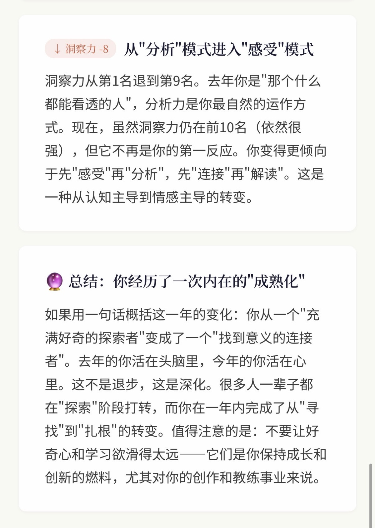 最核心的变化:从”头脑主导”变成了”心灵主导”。 去年你的前4名里有3个是智慧类优势(洞察力#1、好奇心#2、喜爱学习#4),你当时的核心运作模式是”理解、探索、分析”。